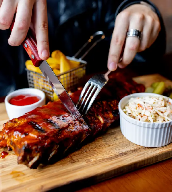 Ribs on Fire restaurant,located at Bożego Ciała 14, in the heart of Krakow’s Kazimierz, – is the first place that served (and still does!) the best and largest ribs in the city. We have been operating continuously since 2014. A slightly more intimate location allows 30-40 people to feast together. The aroma of carefully selected blends of spices and handmade sauces makes it difficult to pass by indifferently.